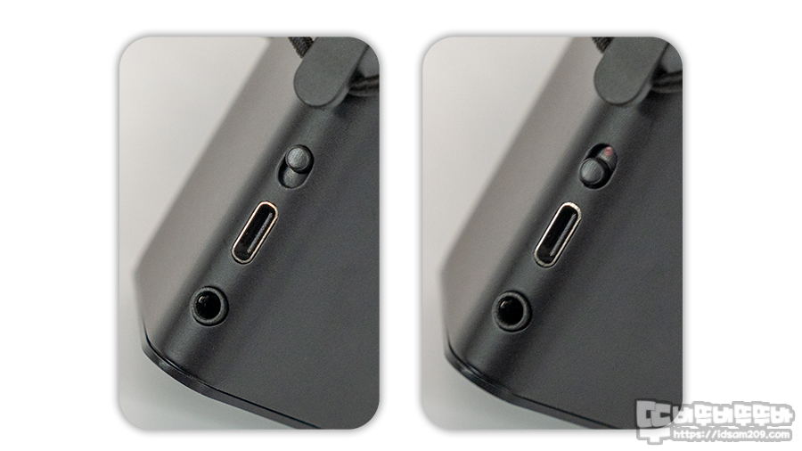 LED 효과와 음소거 LED 효과의 차이는 LED 효과는 마이크 상단에만 LED 표현되자만, 음소거는 상단과 하단 모두 LED 점멸로 표현되어 구분이 가능합니다.