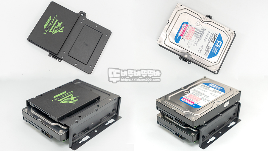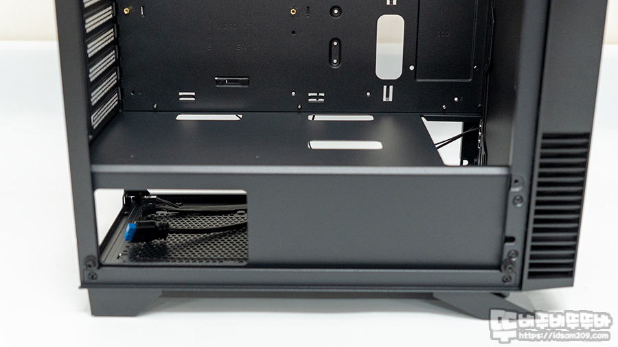 샤시 뒷면에 SSD/HDD 장착 가이드 모습과 하단부의 HDD/SSD 가이드 및 파워서플라이 장착 공간 모습.