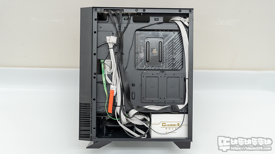 케이스 상단과 중앙에는 케이블을 정리를 위한 정리 홀 그리고 샤시 뒤쪽에 I/O포트 관련 케이블 모습을 확인할 수 있고요.