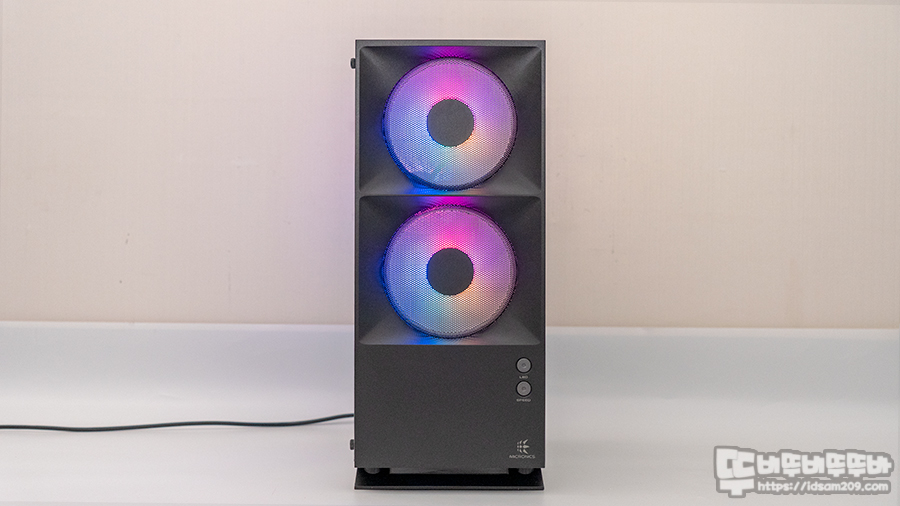 먼저 전면에 파스텔톤 컬러를 보여주는 140mm 쿨러 2개는 원형 그릴을 통해 고정된 컬러를 발산되며 전면 패널의 On/Off 버튼 및 속도 조절 버튼으로 조절이 가능합니다.