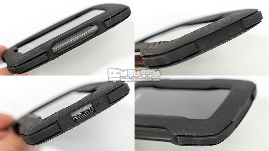 실리콘 케이스는 스마트폰에서 볼 수 있는 충격 보호 케이스 디자인으로 표면에 오돌토돌한 돌기와 엣지부분 그리고 앞뒤 면에 쿠션감을 더해서 떨어뜨리는 충격 및 일상생활에서 사용 시 미끄러짐을 방지해 주는데 일반적인 플라스틱 하우징으로 디자인된 외장 HDD와 비교 시 차별성이 느껴지네요.