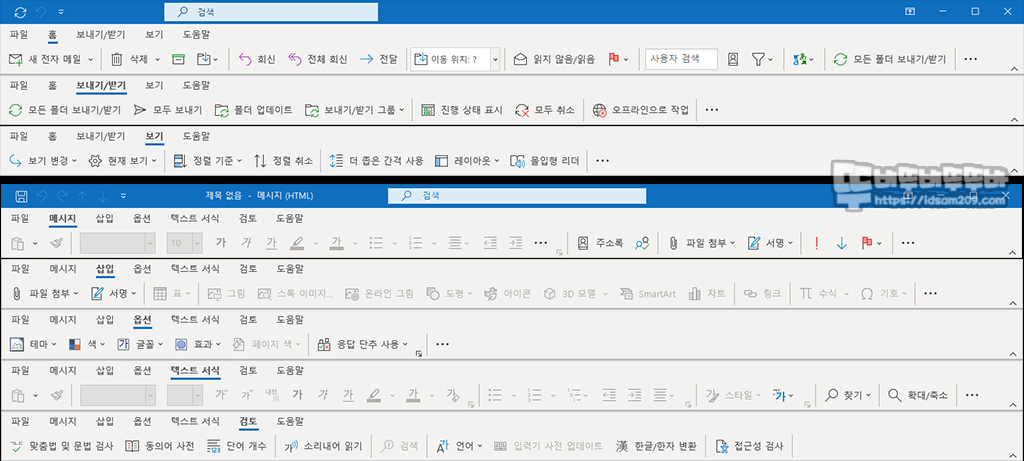 아웃룩 메뉴 구성 및 편지 쓰기 메뉴 구성 모습.