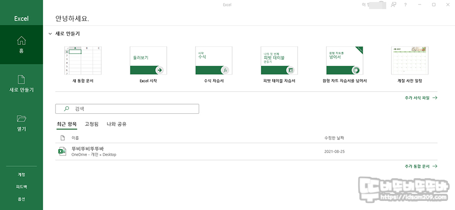 새로 만들기를 통해 새로운 문서 또는 기본으로 제공하는 서식 파일을 이용하고 다양한 엑셀 파일을 활용 및 최근에 작업한 내용도 디테일하게 보여주는 형태로 디자인과 상단 메뉴를 이전 메뉴와 비슷해 보이지만 좀 더 심플하면서 깔끔한 느낌을 줍니다.