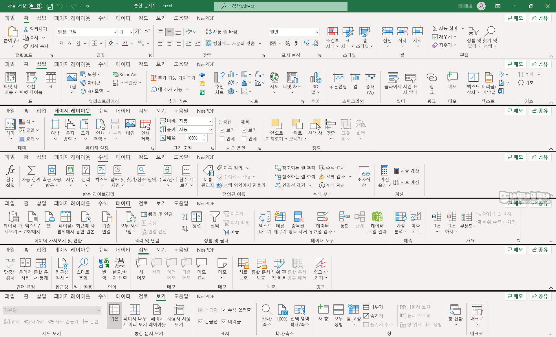 오피스 홈 앤 비즈니스 2021 엑셀 메뉴 구성.