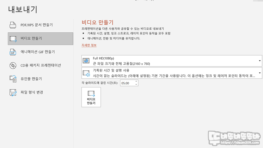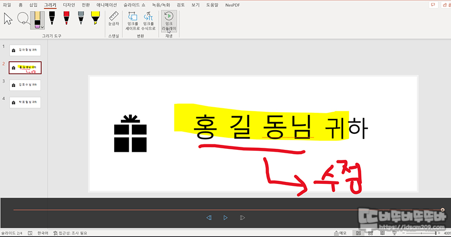 또한 기존의 슬라이드 재생과 다르게 슬라이드 녹음/녹화 기능을 이용하면 슬라이드 과정에 레이저 포인터를 이용한 설명, 잉크 기능을 이용한 드로잉이 가능하여 슬라이드 과정의 수정 사항 및 첨언 부분을 MP4 영상 또는 GIF로 저장이 가능합니다.