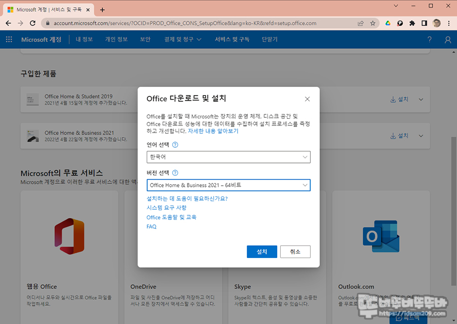 패키지 개봉 시 인쇄된 https://setup.office.com 로 접속하여 설치를 진행해 줍니다.