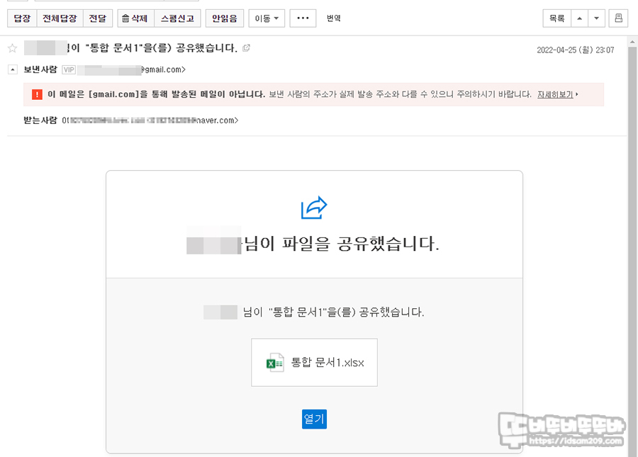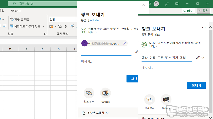 메일로 공유된 엑셀 파일 모습과 링크를 통한 웹 브라우에서 보이는 엑셀 파일 모습.