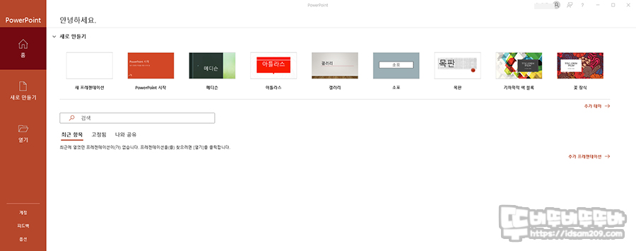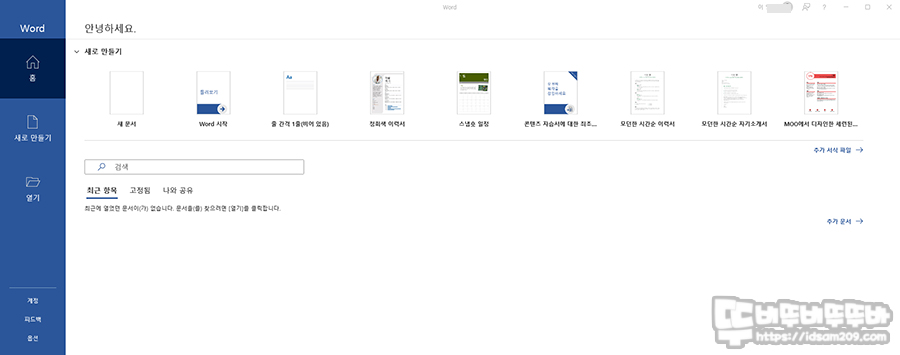 Office Home and Business 2021의 대부분의 프로그램은 시각적인 정보를 지원하는 홈 메뉴로 구성되어 사용자가 필요한 템플릿을 활용하거나 이전에 작업했던 파일을 쉽게 확인할 수 있게 구성하고 있습니다.