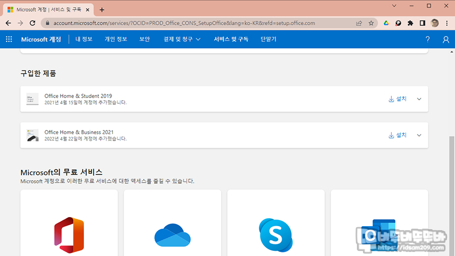 먼저 프로그램 구입 후 설치를 위해서는 MS 공홈의 계정이 필요하니 계정 생성 또는 기존 계정으로 로그인해 주시고 키 카드의 코드 값을 입력하여 진행하면 사용자 계정에 Office Home and Business 2021 소프트웨어가 등록됩니다.