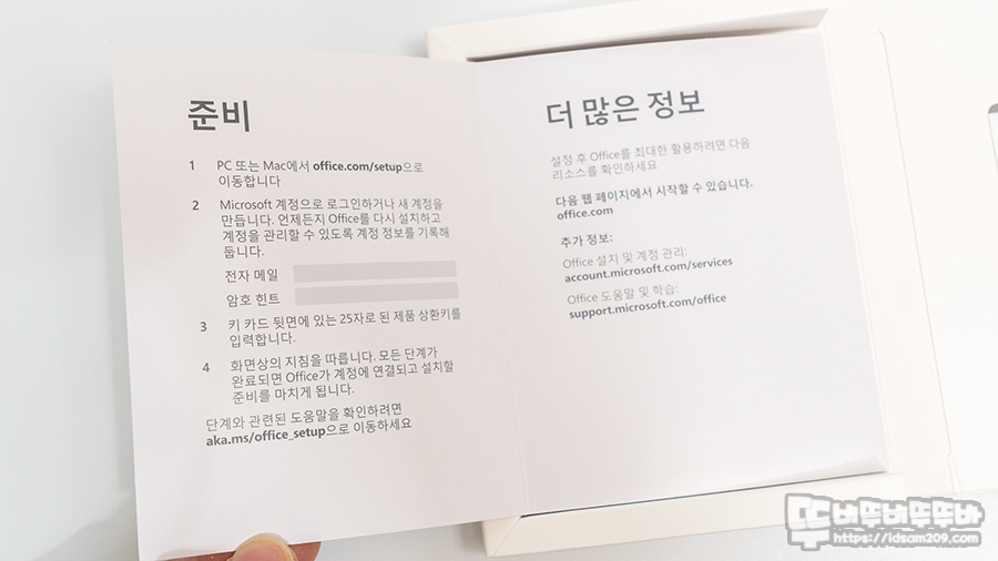 Office Home and Business 2021(PCK)는 마이크로소프트 홈페이지에서 다운로드하는 ESD 방식이 아닌 PKC [Product Key Card] 키 코드를 제공하는 패키지로 종이로만 구성되어 상당히 가볍습니다.