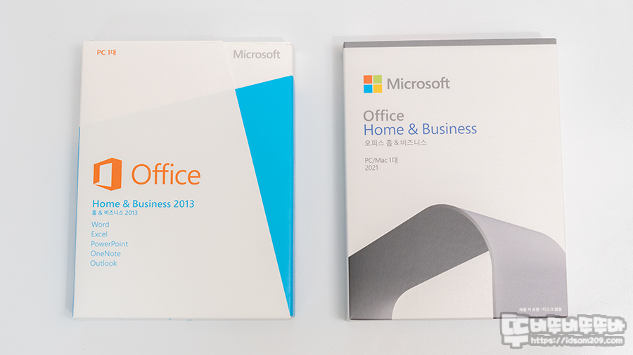 회사에서 사용 중인 Office Home and Business 2013과 Office Home and Business 2021 패키지 비교 모습.