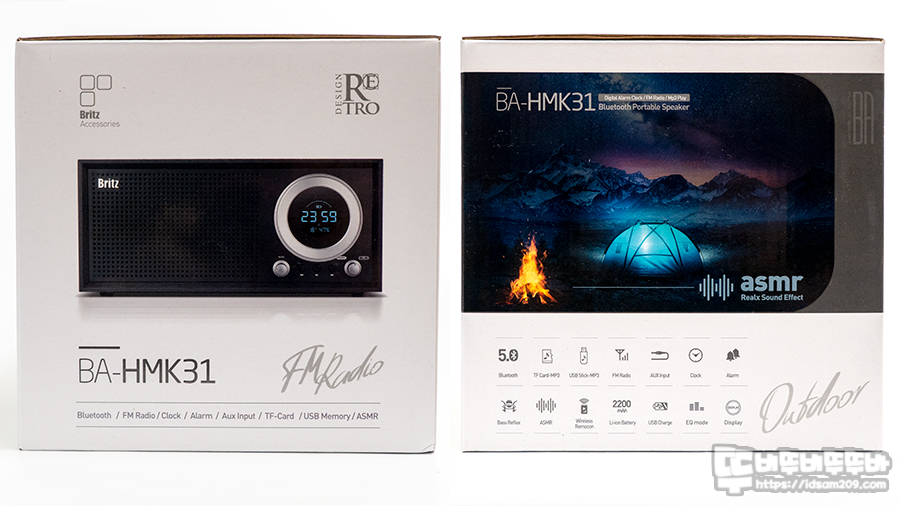 브리츠 BA-HMK31 블루투스 스피커 패키지는 모델명 BA-HMK31, 디지털시계, FM 라디오, MP3 플레이, 블루투스 스피커 등 All-in-On 제품의 기능 특징을 잘 표현하고 있는데요.