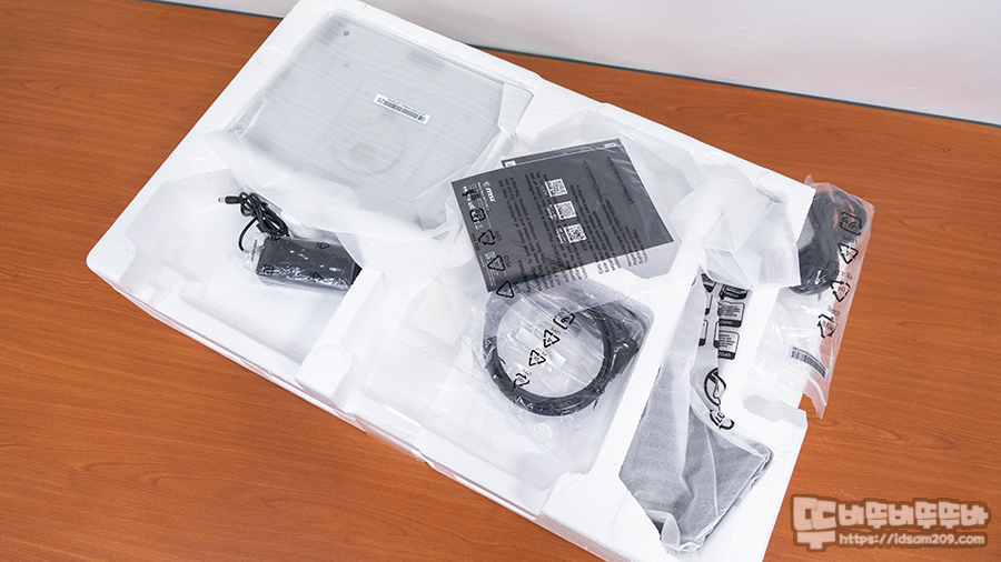 모니터를 앞뒤로 감싸고 있는 스티로폼 윗부분에 모니터 받침대 및 스탠드 연결 케이블 및 전원 아답터 등을 확인할 수 있으며 개인적으로 놀란 점은 모니터를 감싸고 있는 스티로폼이 개봉 중 분리되지 않게 고정하는 띠가 사용되어 안정적으로 모니터를 보호하고 있다는 점이었습니다.