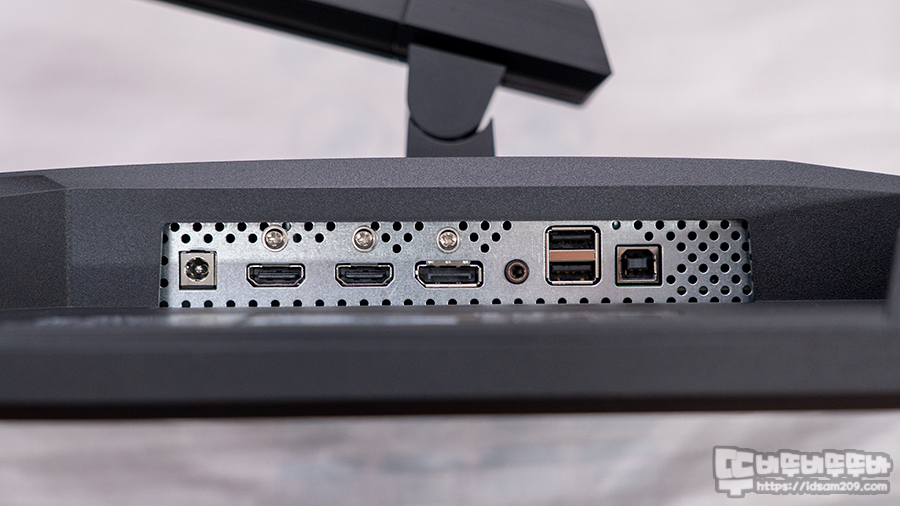 대부분의 단자는 일반적인 구성과 비슷하지만 USB-B 단자는 게이밍 OSD 소프트웨어 사용을 위해 연결이 필요하며 연 시 USB-A 단자 활용도 가능합니다. 특히 스탠드 중앙에 홀을 이용하며 케이블 하면 편리하니 참고하시기 바랍니다.