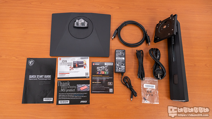 제품의 구성품으로 모니터 이외 퀵 가이드, 각종 안내서, 받침대, 스탠드, 스탠드 고정용 나사, 220V 전원 코드, 전원 아답터, DP to DP 케이블, USB A to B 케이블 그리고 100 by 100 사이즈 베사홀을 이용할 때 사용하는 전용 스탠드오프를 제공하고 있습니다.