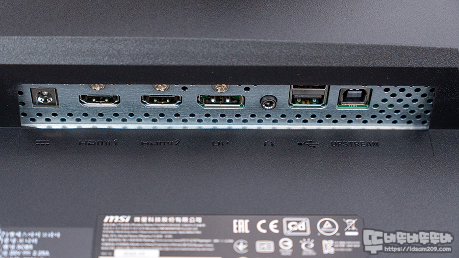 모니터 입력 단자는 2개의 HDMI 단자, DP 단자, 오디오 출력 포트, USB A 타입 단자 2개, USB B 타입 단자로 구성되어 있습니다.