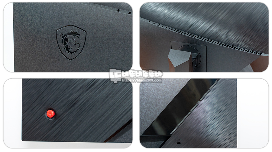 살짝 라운드 된 모니터 뒷면에는 MSI 용 로고 모습과 모니터 열기는 배출하는 통풍 관련 홀, RGB 라이팅 효과를 표현하는 라이팅 존 그리고 OSD 조작을 위한 레드 컬러 조그 버튼 모습을 확인할 수 있는데요.