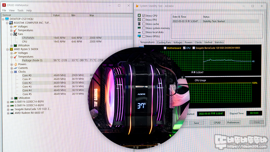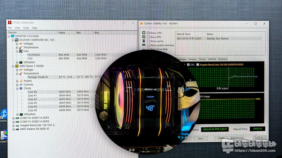 기존에 이런저런 테스트를 해보아도 테스트 시 극한 성능을 보여주는 방식인 AIDA64 시스템 안정화 테스트밖에 없어 AMD 기본 쿨러와 ALSEYE M120D PLUS 쿨러 장착으로 온도 차이를 확인하였으며 CPU 코어가 랜덤하게 피크를 찍고 내려오기 캡처를 하는 당시의 현재 온도 값을 기준으로 비교해 보았습니다.