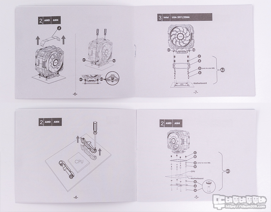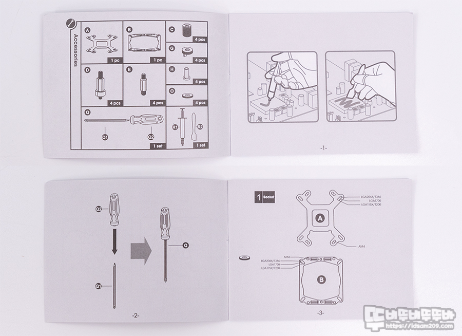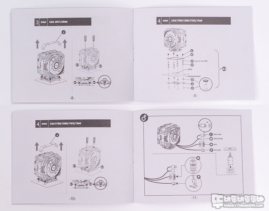 제품은 CPU 쿨러 본체, 인텔/AMD 겸용 백플레이트 및 장착용 스탠드오프, 나사, 너트류 그리고 쿨러 장착 브라켓, ASYSEYE T8 써멀구리스와 스크래퍼, 쿨러 장착용 전용 드라이버로 구성되어 있습니다.