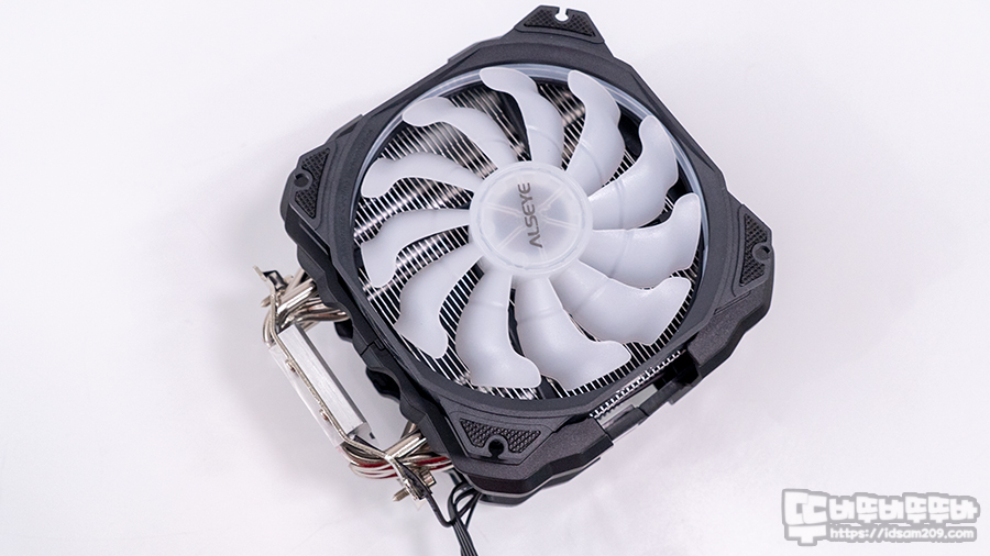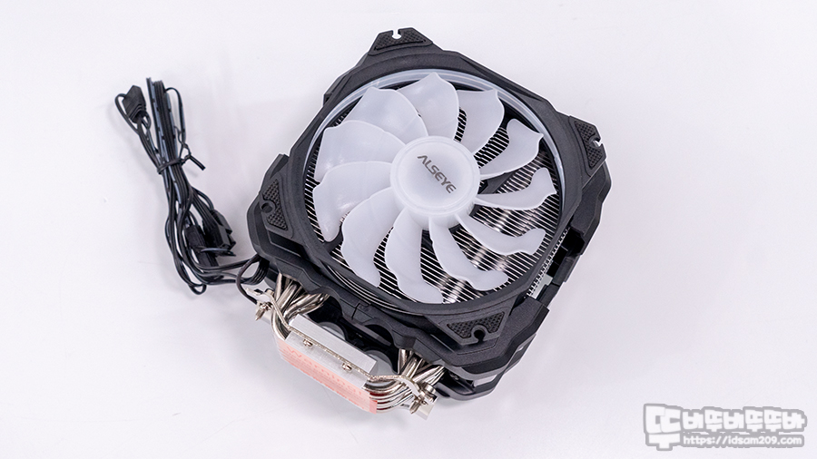 ALSEYE M120D PLUS 쿨링팬과 쿨러 상단에 선명한 LED 효과를 확인할 수 있는데 앞서 설명드린 대로 쿨링팬 측면 필름을 사용하여 LED 효과가 돋보입니다.