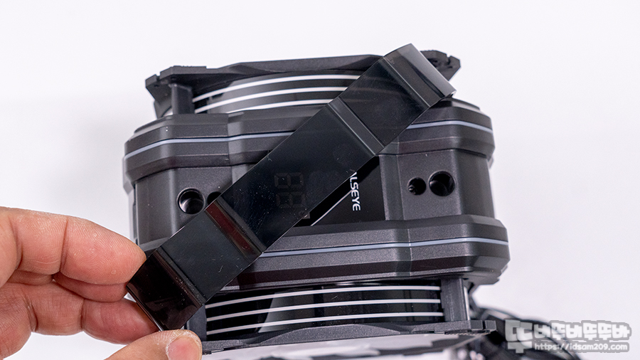CPU 쿨러 상단에 스모크 컬러의 투명 커버를 분리하면 상단의 온도 디스플레이와 쿨러 고정 시 드라이버 비트를 이용하게 되는 홀을 확인할 수 있으니 쿨러 조립 시 커버를 분리해야 하는 점 참고하세요.