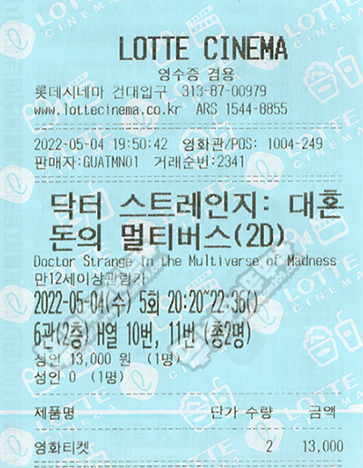 장소 : 롯데시네마 건대입구 6관(레이저) H열 10, 11번