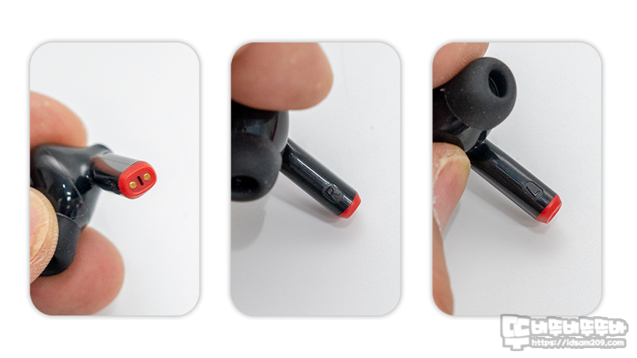 무선 이어버드 끝부분에 레드 컬러 부분에는 충전 단자를 확인할 수 있으며 스틱 안쪽 부분에는 왼쪽, 오른쪽이 구분되는 L, R 각인이 눈에 띕니다.