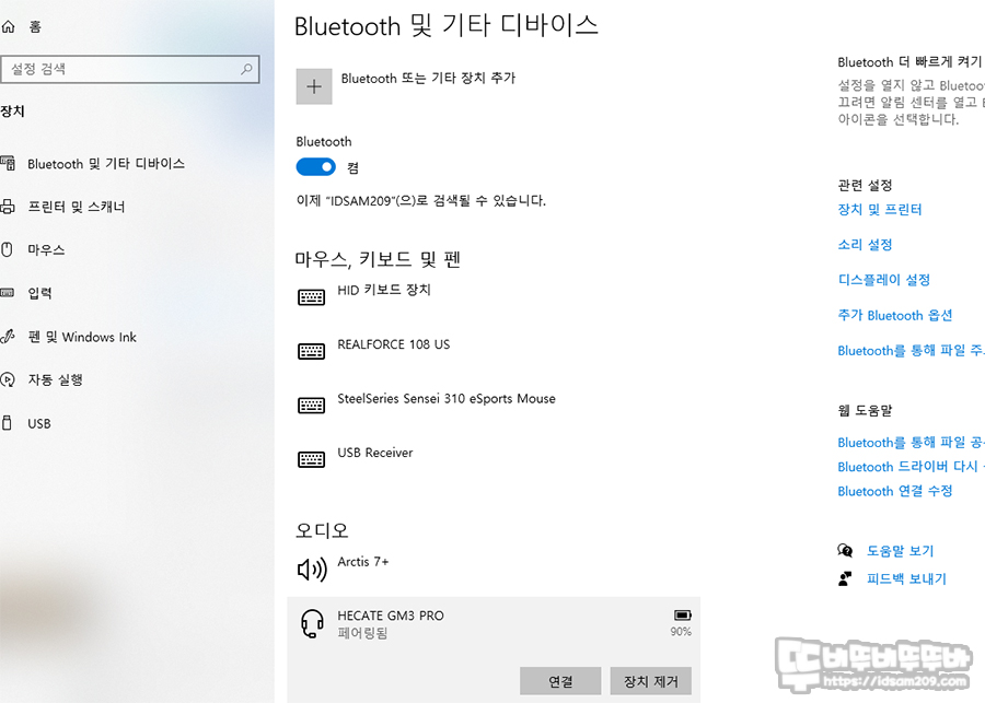 일반 PC의 블루투스 연결 항목에서 HECATE GM3Pro 블루투스 이어폰 배터리 잔량 확인이 가능했고요.