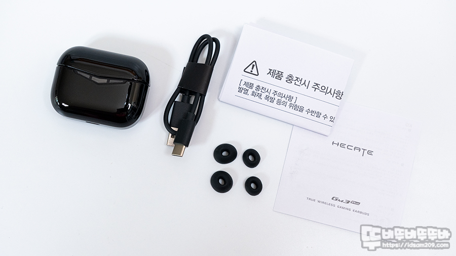 제품은 충전 케이스 + 무선 이어버드, USB-C to A 충전 케이블, 사용 설명서, 여분의 실리콘 이어팁으로 구성되어 있으며 실리콘 이어팁은 기본 중간 사이즈 장착 이외에 대, 소 사이즈를 제공합니다.