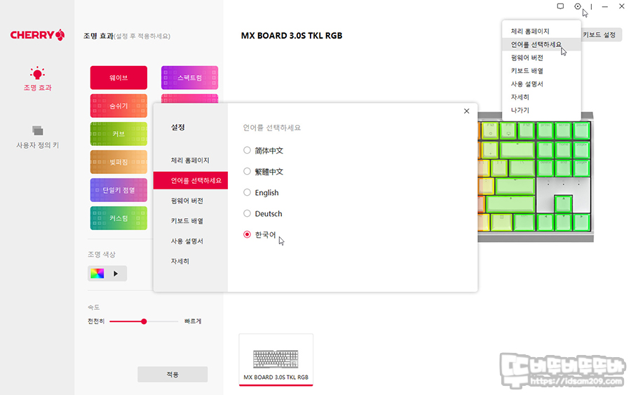 소프트웨어 다운로드를 위한 접근 방식이 독특한 체리 MX BOARD 3.0S RGB TKL 게이밍 기계식 키보드는 ESC와 F1 키 사이에 체리 키를 3초간 눌러 연결되는 소프트웨어 다운로드 사이트를 통해 소프트웨어 다운로드가 가능하며 소프트웨어가 설치된 이후에는 체리 키는 소프트웨어를 호출하는 기능으로 사용하게 되며 프로그램의 오른쪽 상단 ◎ 메뉴를 눌러 언어 선택을 변경하면 한국어 메뉴로 사용이 가능합니다.