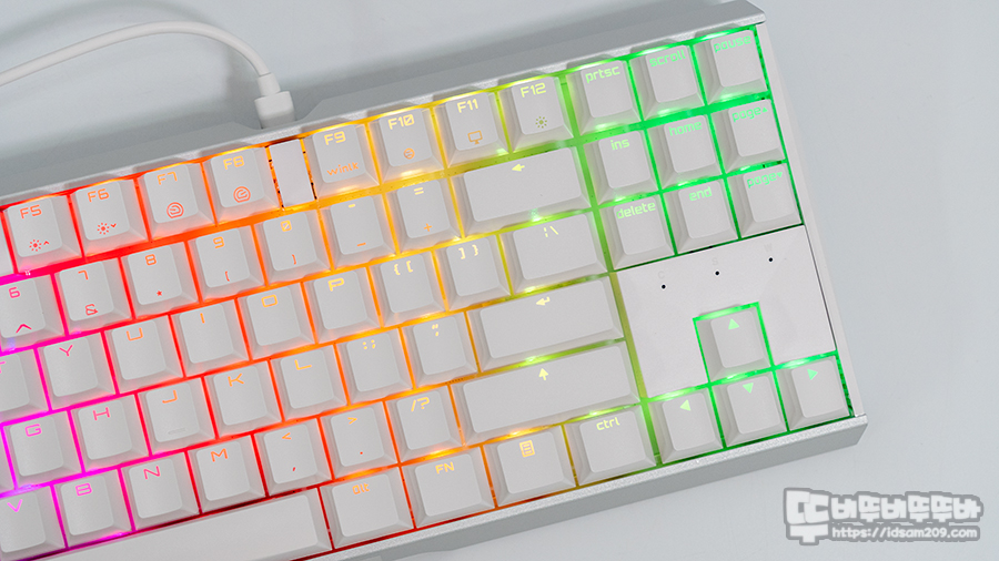 CHERREY MX BOARD 3.0S RGB TKL 게이밍 기계식 키보드는 키캡의 각인 부분에 LED 효과가 잘 표현되는 역방향으로 설계되었으며, ABS 이중 사출 키캡 또한 각인 부분에 LED 라이팅이 잘 투과되는 투명한 소재를 사용하였습니다.