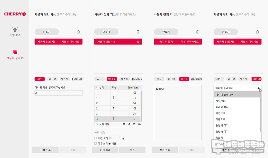 사용자 정의 키 메뉴에서는 기본 키를 다른 키로 변경할 수 있는 키 스와프, 키 입력 매크로, 텍스트 매크로 그리고 기본으로 제공되는 다양한 멀티미디어 기능을 키보드에 부여할 수 있지만 레이어 기능을 지원하지 않기에 기본 문자열을 제외한 모디 키에 설정하시는 게 좋습니다.