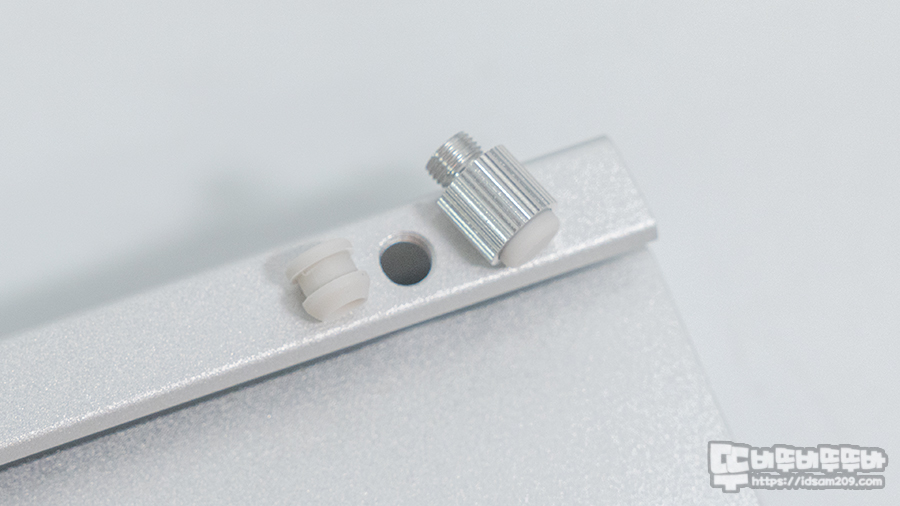 기존에는 실리콘 재질의 사각형 다리를 프레임에 꽂아서 사용했다면 이번에는 상단부분의 실리콘 캡을 제거하고 동봉된 높이 조절 다리를 나사 방식으로 고정하여 사용할 수 있게 되었습니다.