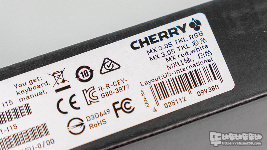 측면의 라벨의 정보를 살펴보면 CHERREY MX BOARD 3.0S RGB TKL (텐키리스) 모델, 체리 MX RGB RED 스위치, 화이트 컬러, US 표준 레이아웃을 확인할 수 있습니다.