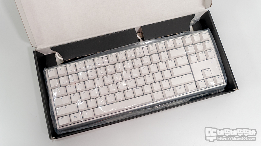 패키지 개봉 시 비닐에 포장된 키보드 모습을 확인할 수 있으며 제품은 키보드 본체, 사용 설명서, 홍보 인쇄물, 탈부착이 가능한 높이 조절 다리로 구성되어 있습니다.