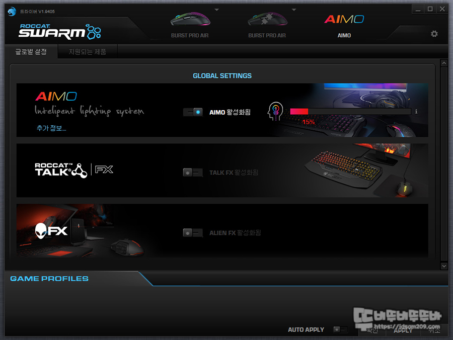 AIMO 기능을 지원하는 키보드, 마우스, 헤드셋 등을 사용할 때 선택이 가능한 AIMO 메뉴 모습.