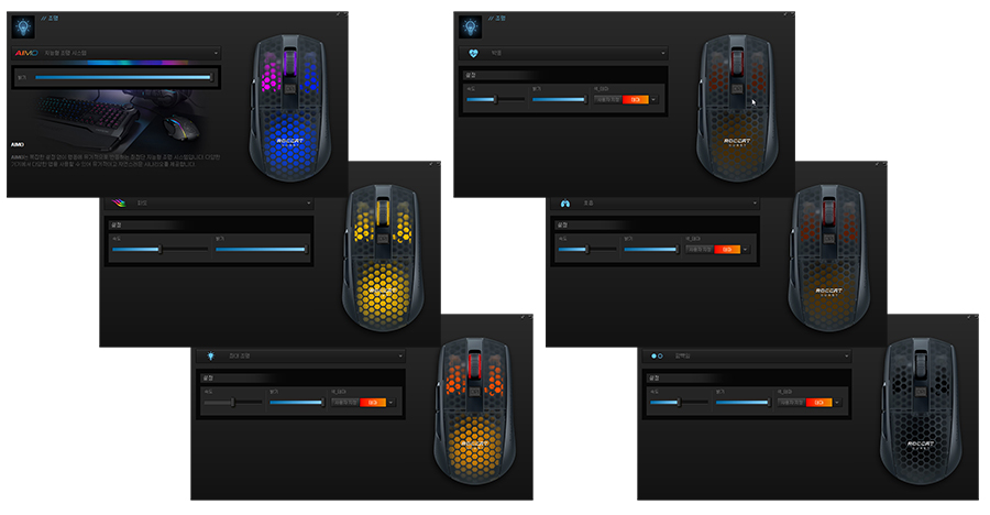 로캣 제품군과 연동되는 AIMO 지능형 조명 시스템 이외에 다양한 조명을 선택이 가능한데 조명 메뉴에서는 4개의 LED 구역에서 독립적인 선택이 불가능하며 그라데이션 위주의 전체적인 조명 효과로만 선택이 가능하여 LED 표현에 대한 자유도가 없는 편입니다.