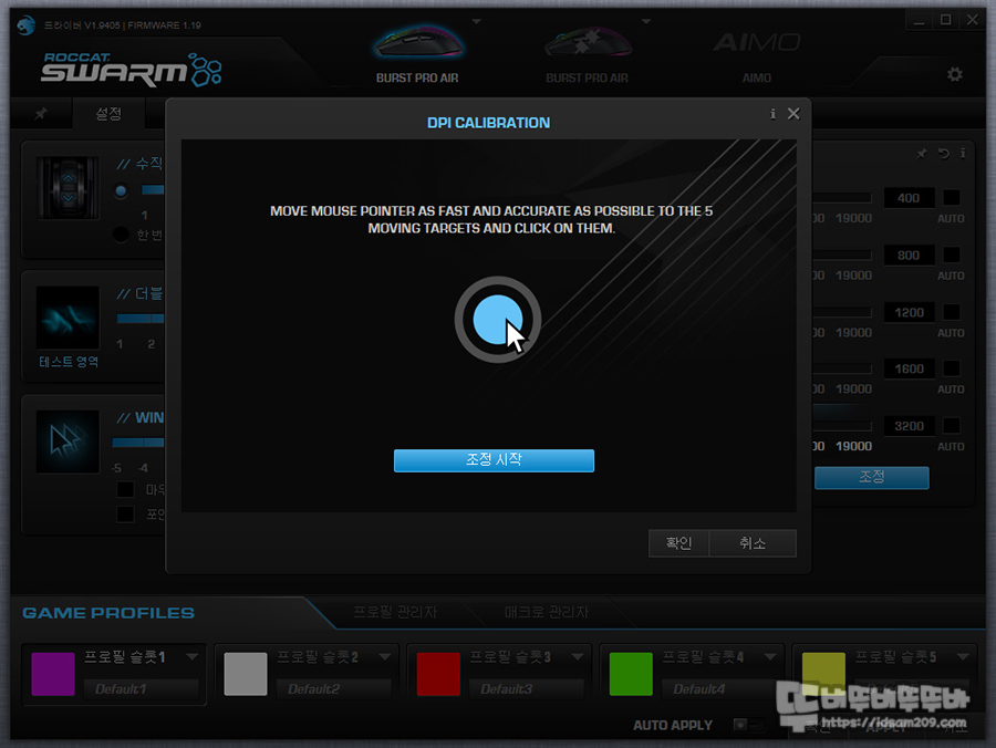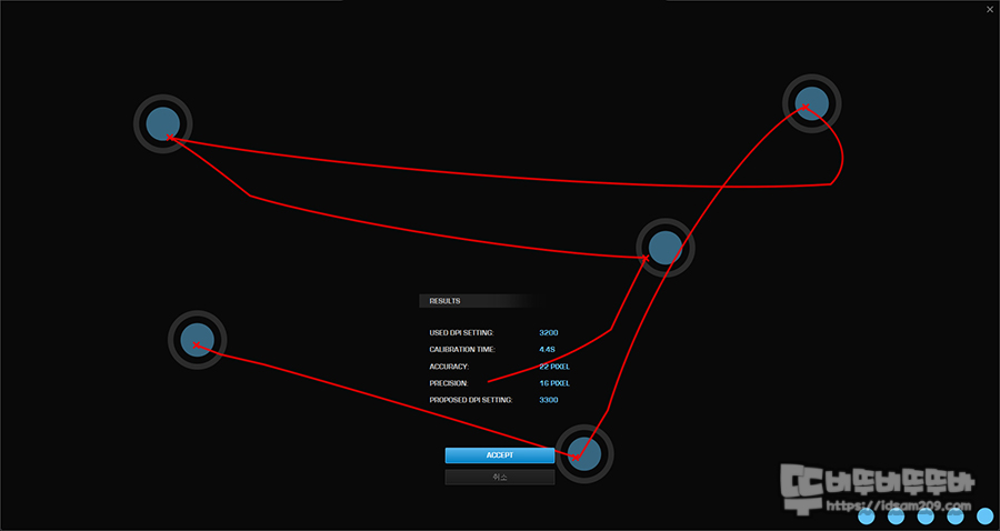조정 시작 버튼을 누르면 플래시 암산 게임 형태로 3, 2, 1 카운터가 끝나고 보이는 점을 빠르게 선택하여 사용자에게 최적화된 결과값을 보여주며 이 값을 DPI에 적용하시면 좋으니 사용하는 마우스 패드 위에서 최적화된 DPI 설정을 해보시기 바랍니다.