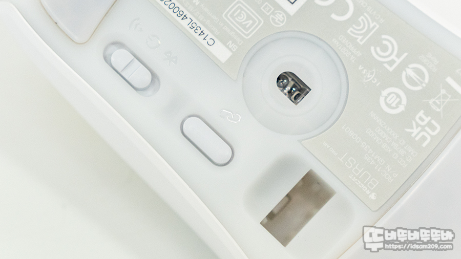 바닥면에는 RF 2.4GHz / 전원 Off / 블루투스 연결을 선택하는 전원 스위치와 페어링 버튼 그리고 전용 무선 리시버를 수납하는 홀을 확인할 수 있으며 마우스 중앙에는 19,000 DPI를 지원하는 PMW-3370 기반의 Owl-Eye Optical 센서 위치를 확인할 수 있습니다.