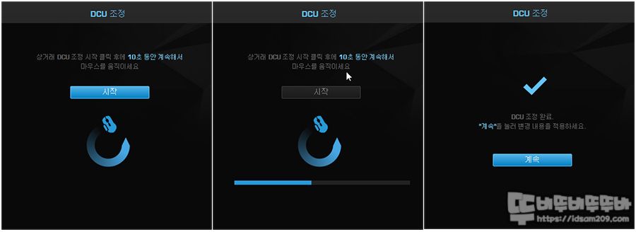 설정 선택 후 시작 버튼을 눌러 마우스를 10초 동안 원형으로 마우스를 움직이면 조정이 완료됩니다.