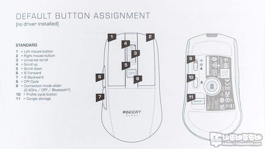 대칭형 오른손 전용 ROCCAT BURST PRO AIR 무선 게이밍 마우스는 사이드에 미끄럼 방지를 위한 허니콤 무늬 각인 그리고 상단부 하우징을 허니콤 타공과 그 위로 반투명 커버를 더하여 LED 라이팅 효과를 극대화하는 디자인이 적용되었으며 바닥면에는 마우스 앞/뒤면에 널찍하게 커버되는 슬라이드 성향의 PTFE 글라이드 모습 그리고 RF 2.4GHz 무선 또는 블루투스를 선택하는 전원 스위치, 페어링 버튼, 리시버 수납 홀을 확인할 수 있습니다.