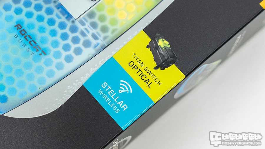 ROCCAT BURST PRO AIR 무선 게이밍 마우스 패키지에는 제품의 컬러를 표현하는 제품 이미지와 BURST PRO AIR 모델명과 2.4GHz 무선 및 타이탄 광학 스위치, 스텔라 무선 기능에 대한 강조가 눈에 띄네요.