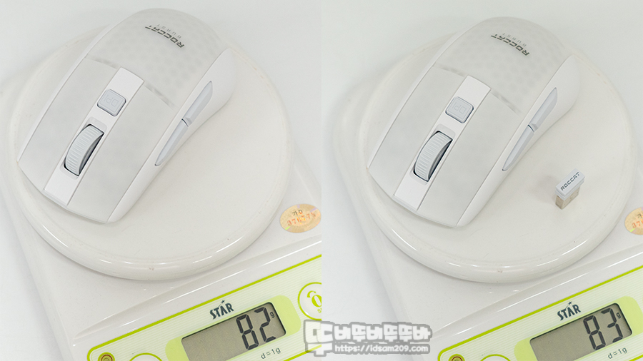 1g 단위로 측정할 수 있는 디지털 저울로 마우스 무게를 측정 시 무선 리시버를 포함한 무게는 약 83g, 리시버를 제외한 무게는 약 82g으로 확인되며 무선 마우스치고는 생각보다 가볍진 않지만 적당한 무게감을 주는 편입니다.