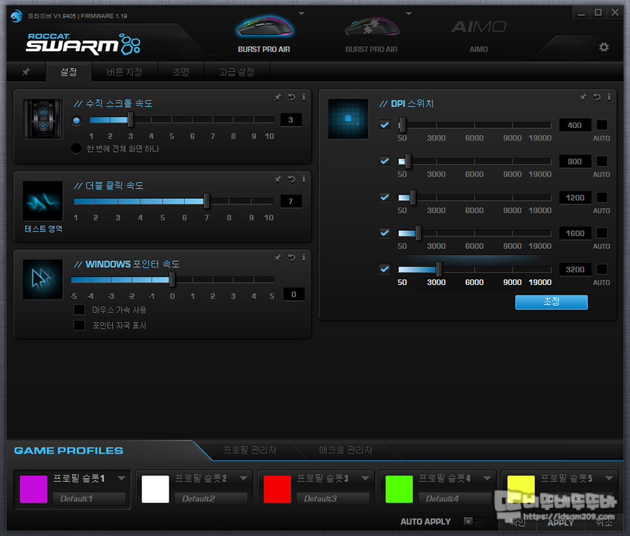 메뉴의 구성은 왼쪽의 윈도우즈 마우스 제어판에서 볼 수 있는 속성 기능과 오른쪽의 DPI 설정 그리고 아래에 프로파일 설정과 매크로 관리자로 구분되어 있으며 DPI의 기능은 V 표시로 1~5단계로 선택으로 사용 가능하며 슬라이드 바를 이용하여 50 단위로 변경하여 최대 19,000 dpi까지 설정할 수 있습니다.