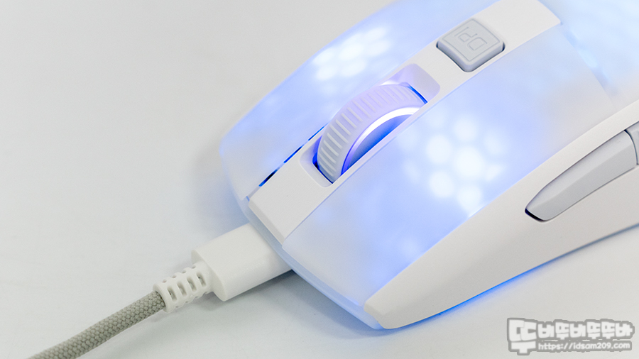 절개형으로 디자인된 메인 버튼과 휠 스크롤, 마우스 하우징에 4개의 LED 구역에 1680만 컬러의 AIMO RGB 라이팅 효과로 블링블링한 효과가 표현되지만 화이트 컬러는 RGB LED 효과가 조금 퍼지는 느낌이 있어 선명한? LED 효과를 원하신다면 블랙 컬러 선택을 추천드립니다.