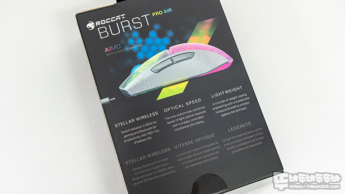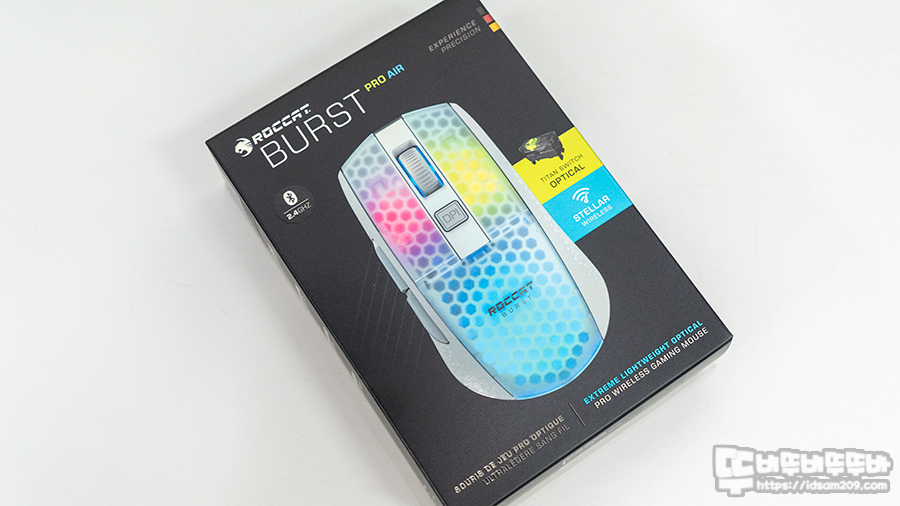ROCCAT BURST PRO AIR 무선 게이밍 마우스 패키지에는 제품의 컬러를 표현하는 제품 이미지와 BURST PRO AIR 모델명과 2.4GHz 무선 및 타이탄 광학 스위치, 스텔라 무선 기능에 대한 강조가 눈에 띄네요.