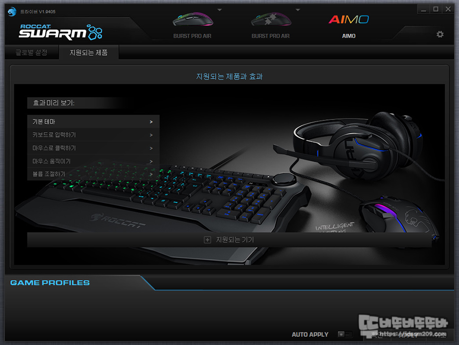 AIMO 기능을 지원하는 키보드, 마우스, 헤드셋 등을 사용할 때 선택이 가능한 AIMO 메뉴 모습.
