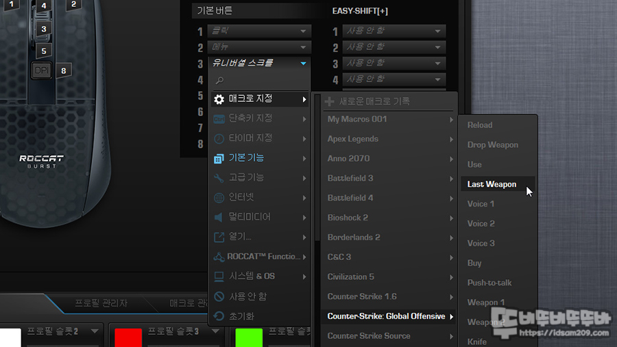 로캣 마우스 타사의 게이밍 마우스와 차별화되는 부분은 매크로 항목에 일반적인 키 매크로 이외 게임에 최적화된 기능을 설정할 수 있는 매크로 파일을 제공하고 있어 사용자가 게임에서 빠르게 사용할 수 있는 기능을 버튼에 부여할 수 있다는 점인데요.