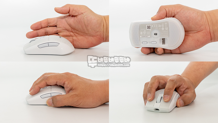 평소 사용하는 마우스 하우징 끝부분이 손바닥 끝에 닿는 클로우 그립으로 사용 시 사이드의 뒤로 가기 버튼 사용이 불편해서 사이드 버튼 중간에 엄지손가락이 위치하는 핑거 그립으로 사용해야 마우스 버튼을 밸런스 있게 사용할 수 있었습니다.