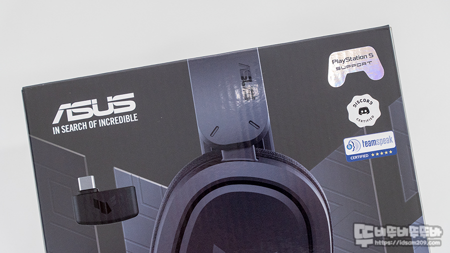 ASUS TUF H1 WIRELESS 무선 헤드셋 패키지에는 무선 제품임을 확인할 수 있는 무선 리시버와 헤드셋 사진 그리고 모델명 그리고 PS5 지원, Discord 인증, teamspeak 인증에 대한 내용을 확인할 수 있네요.